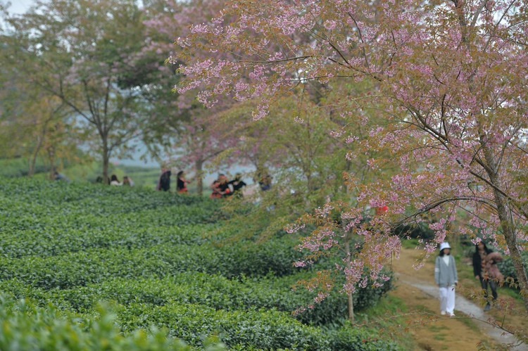 | Hoa mai anh đào nở rộ trên đồi chè Ô Long. Nguồn ảnh: Khánh Huy |