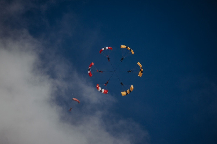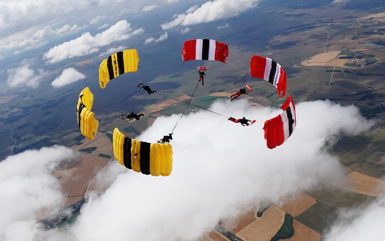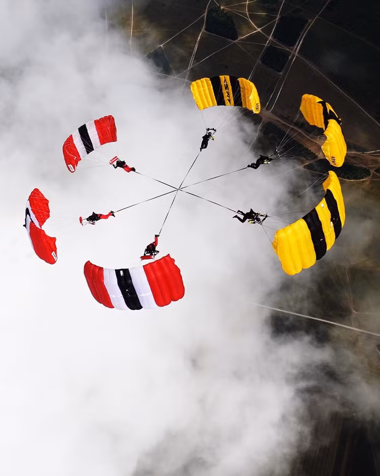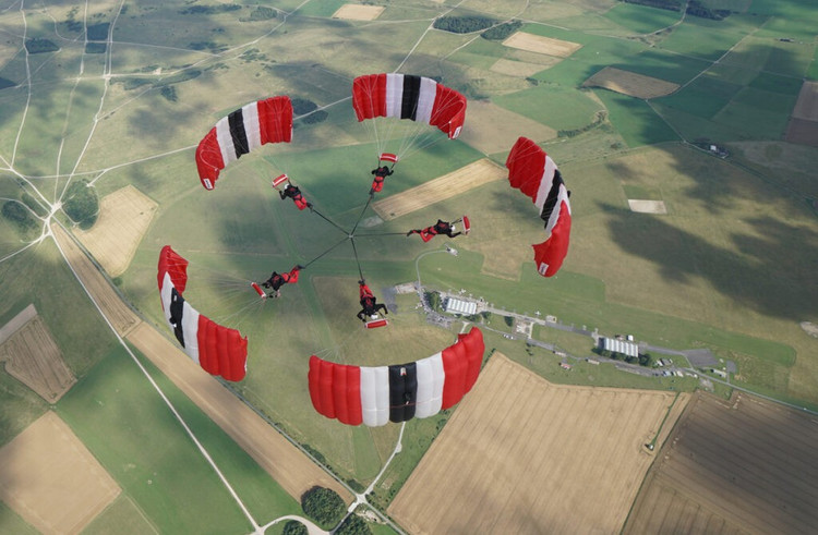 Quân đội Mỹ và Quân đội Anh đã tạo điều kiện cho đội hình sáu người đầu tiên trên thế giới tham gia cuộc thi nhảy dù quân sự ở Wiltshire, Anh. Động tác này thường được thực hiện bởi hai người, cố tình điều khiển dù của họ theo hướng ngang thay vì lướt theo chiều thẳng đứng thông thường.