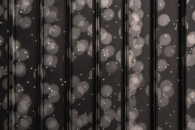 Sơ đồ trực quan trừu tượng các tấm graphene oxit (lớp màu đen) nhúng với kim cương nano (các điểm trắng sáng). Kim cương nano tạo ra lực tĩnh điện tầm xa (vòng tròn trắng) ổn định các tấm GO trong điều kiện ẩm ướt, hình thành vật liệu màng tinh chế hydro. Tác giả Yasuhiro Chida và Toru Tsuji.