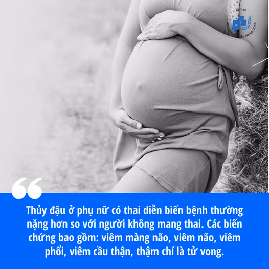 Trong thời kỳ mang thai, nhiễm thủy đậu có thể gặp biến chứng viêm phổi, có thể dẫn đến biến chứng nặng nề khác, thậm chí là tử vong. Nhiễm thủy đậu trong thời kỳ này cũng có thể có nguy cơ gây ra các bất thường về thai, đặc biệt là trong 20 tuần đầu của thai kỳ.
