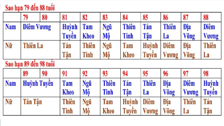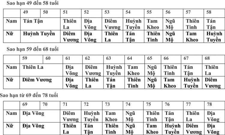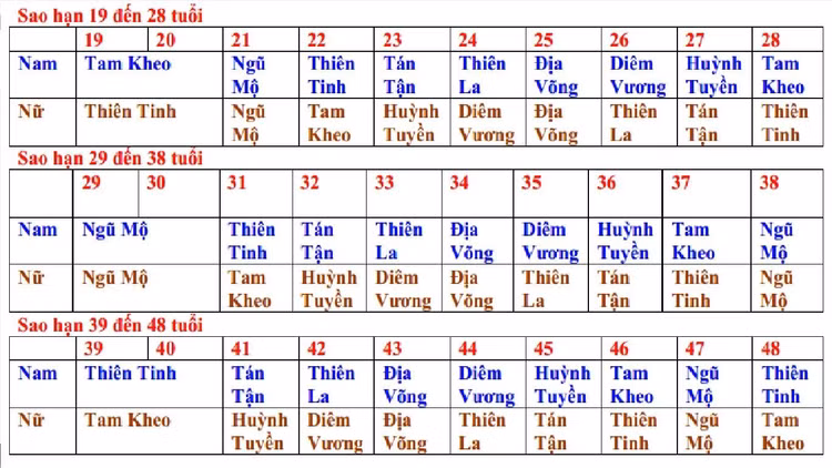 Bảng tra các “Sao hạn” theo từng tuổi: