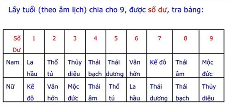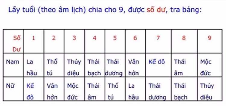 Trường hợp năm nay bạn 55 tuổi (tính theo âm lịch), bạn chia cho 9, sẽ dư 1, nếu là nam thì bạn ứng với sao La Hầu, nữ ứng với Kế Đô.