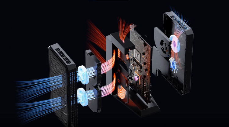 Minisforum đã thiết kế ổ cắm điện AC trên chân đế, đảm bảo người dùng luôn để máy đứng, gắn chân đế chứ không thể đặt nằm ngang. Việc này rất quan trọng, vì nó tác động lớn đến thông gió, tản nhiệt cho hệ thống. Công nghệ làm mát độc quyền Cold Wave Ultra cũng là yếu tố then chốt để Minisforum đạt được chứng nhận AMD Advantage.