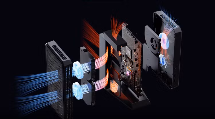 Minisforum đã thiết kế ổ cắm điện AC trên chân đế, đảm bảo người dùng luôn để máy đứng, gắn chân đế chứ không thể đặt nằm ngang. Việc này rất quan trọng, vì nó tác động lớn đến thông gió, tản nhiệt cho hệ thống. Công nghệ làm mát độc quyền Cold Wave Ultra cũng là yếu tố then chốt để Minisforum đạt được chứng nhận AMD Advantage.