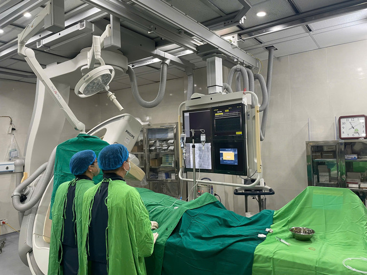 Bác sĩ thực hiện can thiệp mạch vành cho bệnh nhân. Ảnh Bệnh viện Đa khoa tỉnh Lạng Sơn