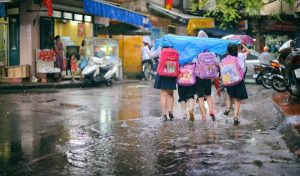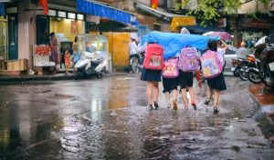 Sáng, trời mưa tầm tã. Đúng vào giờ đưa con đi học. Cổng trường dường như còn đông hơn mọi ngày. Ai cũng áo mưa lùng thùng, cố đi chậm, tránh đường cẩn thận để con khỏi ướt.