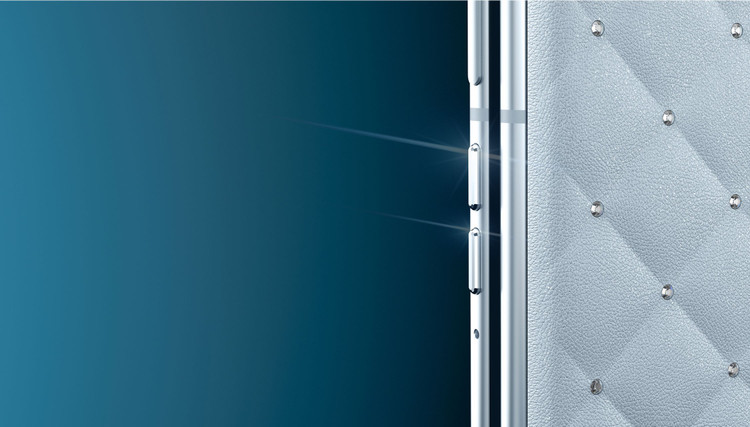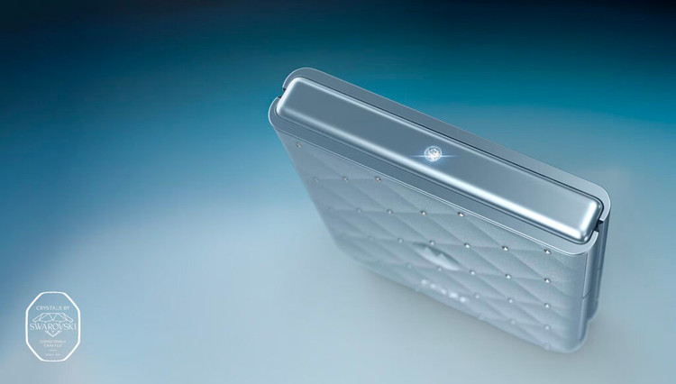 Bản lề cũng chứa một viên pha lê lớn, được cắt chính xác với 26 mặt cắt, cạnh phải có các phím âm lượng lấy cảm hứng từ pha lê.