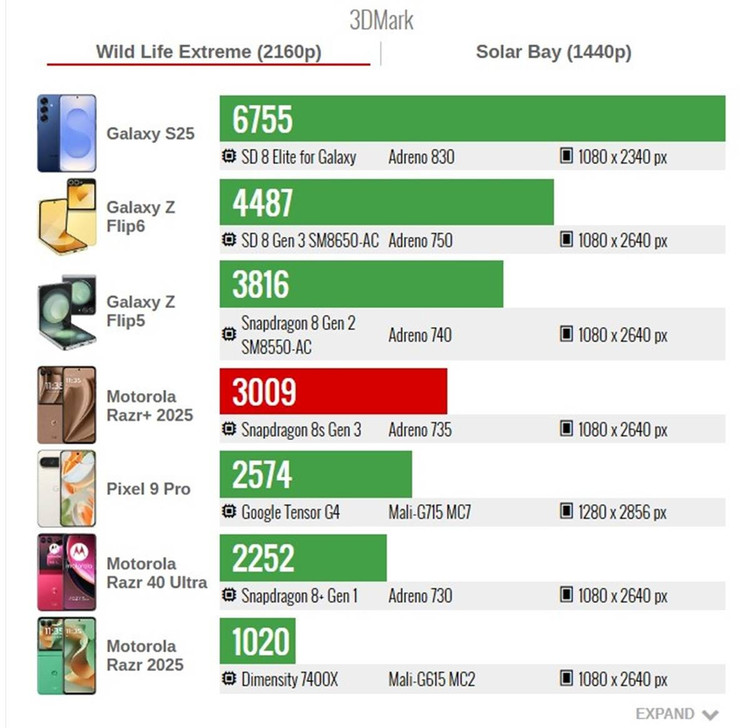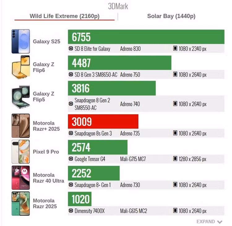 Motorola Razr 2025 Plus sử dụng lại con chip Snapdragon 8s Gen 3 từng xuất hiện trên thế hệ năm ngoái. Dù được gọi là chip cao cấp, nhưng thực tế đây chỉ là dòng cận cao cấp với hiệu năng ở mức khá. Tuy nhiên, nó vẫn mạnh hơn đáng kể so với Dimensity 7400 trên bản thường và tất nhiên kém xa Snapdragon 8 Elite được trang bị trên bản Ultra.