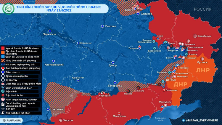 Ngày 21/5, quân đội Ukraine pháo kích ác liệt vào khu vực Zolote-4. Giao chiến ác liệt tiếp tục diễn ra theo hướng Lysychansk-Severodonetsk. Pháo binh Luhansk và Nga tập kích hỏa lực ác liệt, gây thiệt hại nặng nề về sinh lực và trang thiết bị của quân đội Ukraine.