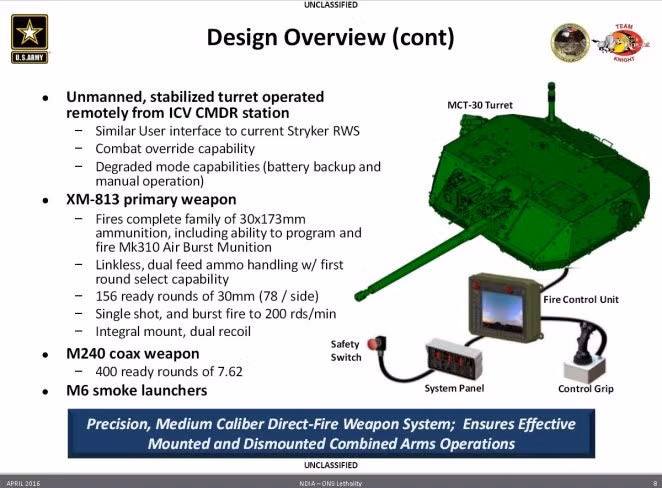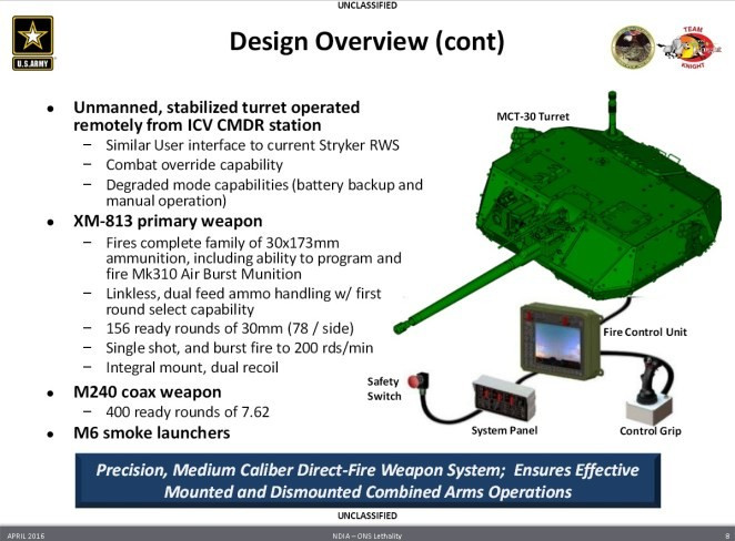 Việc chuyển đổi từ súng phóng lựu cỡ nòng .50 hoặc 40mm cũ sang pháo 30mm XM813 là một trong những sự gia tăng hỏa lực đáng kể nhất đối với dòng xe Stryker kể từ khi được đưa vào sử dụng lần đầu vào đầu những năm 2000.