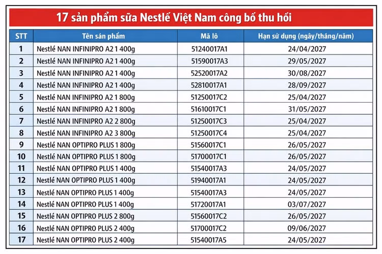 Ngày 8/1, Công ty TNHH Nestlé Việt Nam phát thông báo trên trang nestle.com.vn về việc thu hồi 17 lô sữa công thức dành cho trẻ nhỏ mang thương hiệu NAN, được nhập khẩu và phân phối tại thị trường Việt Nam. Các lô sản phẩm bị ảnh hưởng được doanh nghiệp công bố chi tiết theo tên sản phẩm, mã lô và hạn sử dụng.