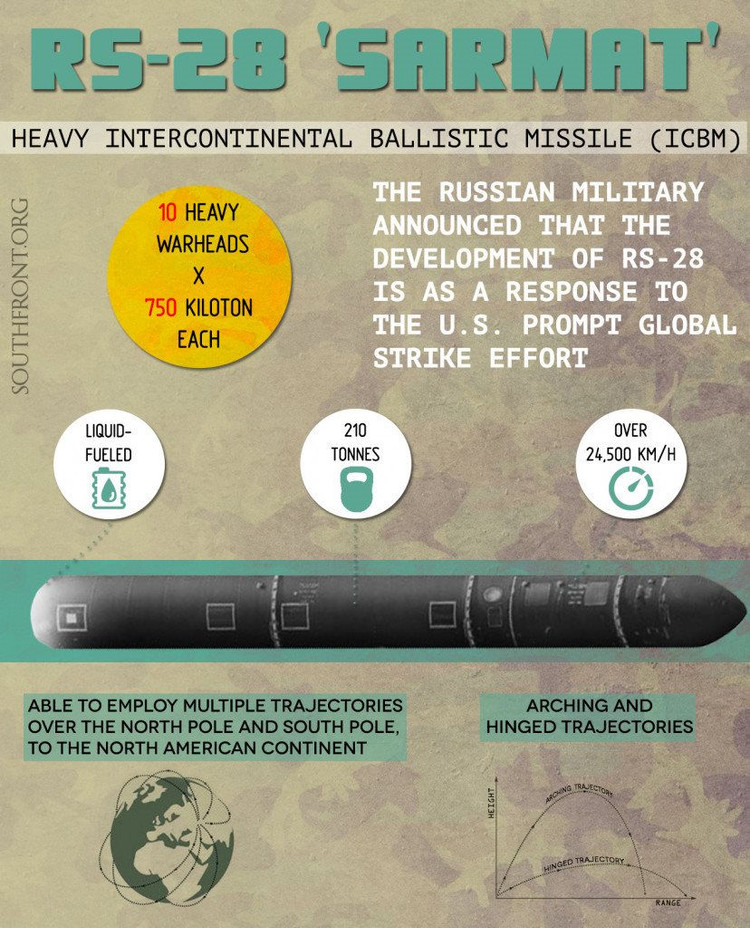 Tên lửa có thể bay theo các đường bay không thể dự đoán và vòng tránh các khu vực phòng thủ tên lửa. Tên lửa có thể bay qua Bắc Cực hay Nam Cực, tiếp cận mục tiêu từ các hướng không thể dự kiến để đánh chặn. Để Sarmat trở thành vũ khí không thể ngăn chặn, tên lửa được trang bị phương tiện bay siêu thanh Avangard.