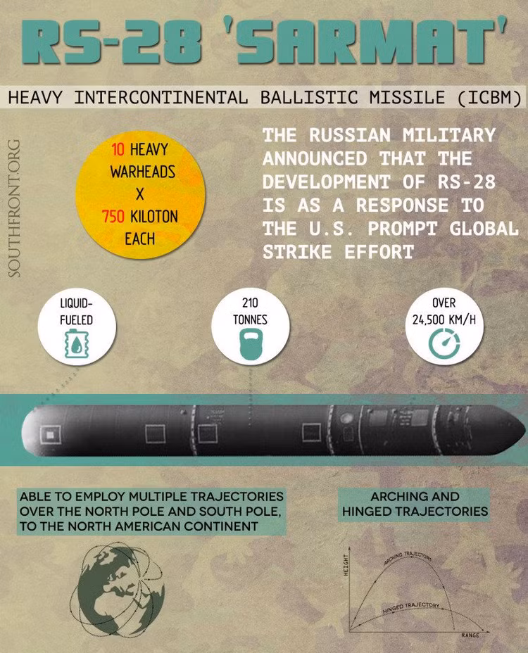 Nhờ những đặc điểm này, tên lửa Sarmat có thể vượt qua bất kỳ hệ thống phòng thủ chống tên lửa nào hiện nay và tương lai. Sarmat là tên lửa ICBM mạnh nhất, tầm bắn xa nhất thế giới, trở thành vũ khí răn đe chủ lực của lực lượng hạt nhân chiến lược Nga.
