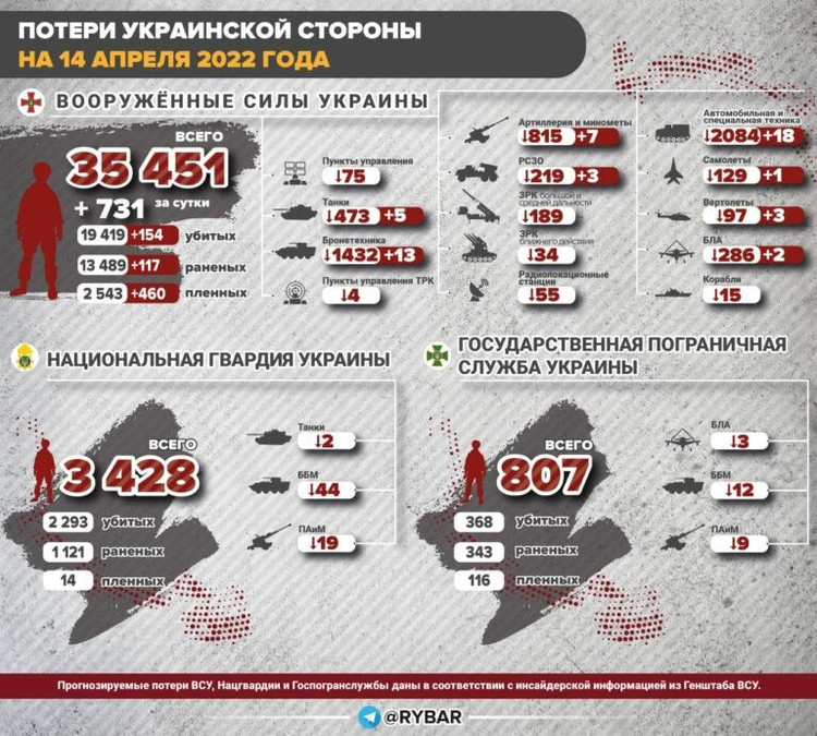 Bộ Tổng tham mưu Quân đội Ukraina công bố số liệu tổn thất ngày 14/4. Trong ngày, 731 quân nhân Ukraina bị loại khỏi vòng chiến, bao gồm tử trận, bị thương và tù nhân chiến tranh. Tổng cộng 460 người bị bắt tù binh trên toàn bộ chiến trường.