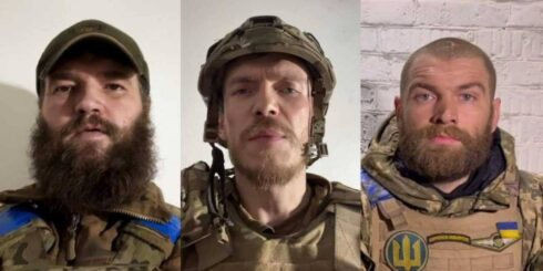 Chỉ huy trung đoàn Azov Denis Prokopenko (giữa), phó Tư lệnh Svyatoslav Palamar (Kalina, trái) và quyền chỉ huy Lữ đoàn 36 Lính thủy đánh bộ Sergei Volynsky (Volyna, phải) hiện đang bị quân đội Nga giam giữ.