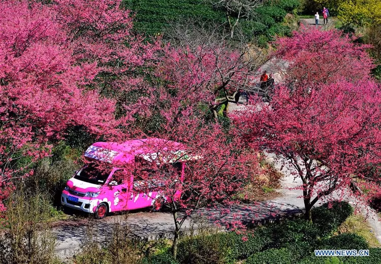Người dân tản bộ bên dưới hàng hoa anh đào trong tiết trời nắng ấm tại đồi trà ở huyện Yongfu.