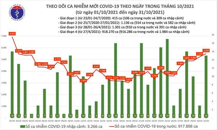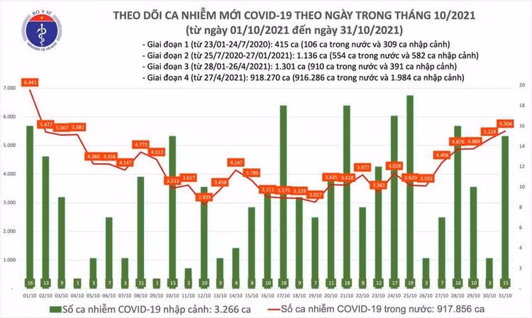 Theo Bộ Y tế, từ 18h ngày 30/10 đến 18h ngày 31/10 cả nước ghi nhận 5.519 ca nhiễm mới, trong đó 15 ca nhập cảnh và 5.504 ca ghi nhận trong nước (tăng 280 ca so với ngày trước đó) tại 46 tỉnh, thành phố (có 2.327 ca trong cộng đồng).