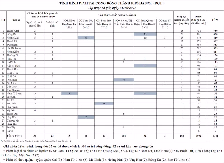 Theo CDC Hà Nội, từ 18h ngày 30/10 đến 18h ngày 31/10 Hà Nội ghi nhận 49 ca bệnh trong đó: cộng đồng (12), khu cách ly (29), khu phong tỏa (8). Trong đó: Hà Đông (17), Quốc Oai (9), Hoàng Mai (7), Nam Từ Liêm (4), Long Biên (3), Mê Linh (3), Ứng Hòa (2), Đống Đa (2), Hoài Đức (1), Bắc Từ Liêm (1)