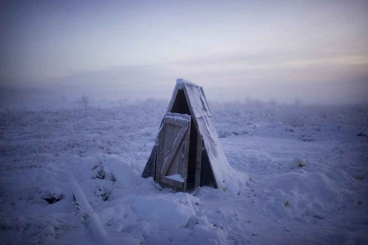 Mặt đất hoàn toàn đông lạnh và dĩ nhiên là đường ống dẫn nước tới các hộ gia đình cũng bị đóng băng. Thay vào đó, người ta sử dụng nước trực tiếp từ bên ngoài. Hình bên dưới, một căn nhà vệ sinh bên ngoài và việc đi vệ sinh vào mùa đông cũng không phải là chuyện dễ dàng.