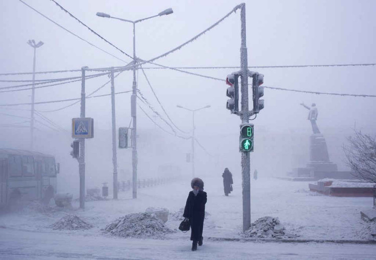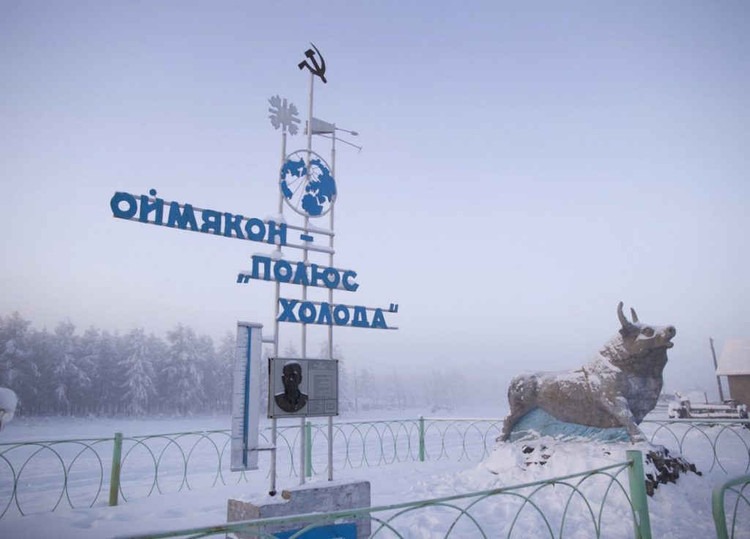 Tượng đài đặt trước lối vào ngôi làng với nhiệt kế chỉ âm 71,2 độ C. Dòng chữ tiếng Nga nghĩa là “Oymyakon – Vùng đất cực lạnh giá.”