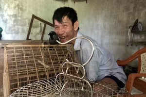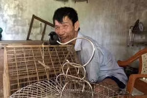 Anh Phạm Văn Cầm đang vỗ về “bạn cùng nhà” là chú chim nhỏ.