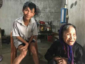 Bà Cương kể, miệng món mém nhai trầu. Bà cười lớn, rồi nhìn con trai đang ngồi vẹo vọ trên ghế. Anh Cầm có lẽ hiểu, phấn khích, cười lớn hơn. “Khi nó sống lại, nó bú nhiều, ăn uống tốt, nhưng cứ nằm một chỗ cho đến năm 12 tuổi, cũng chẳng biết nói năng gì. Ôi, nỏ kể hết khổ khi nuôi cái thằng ni…”.