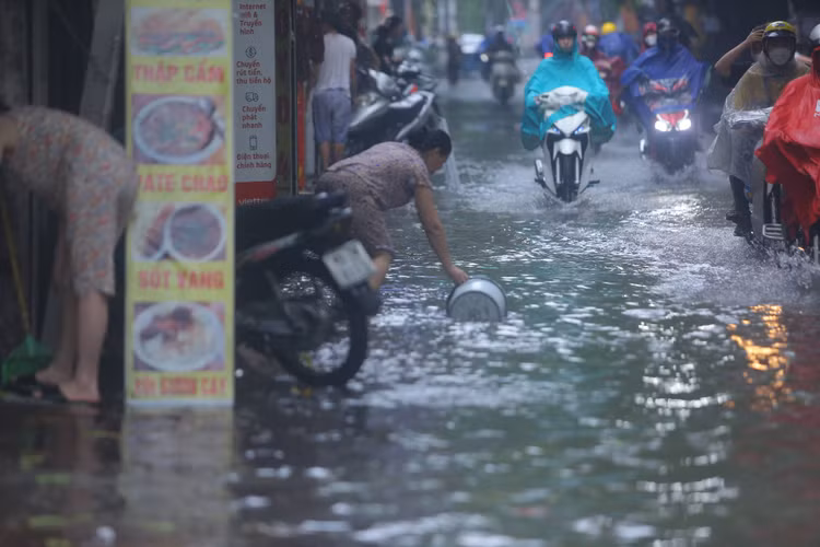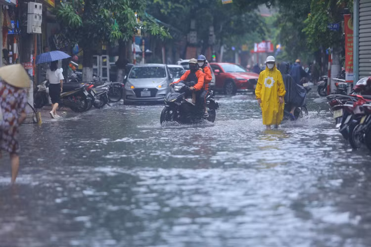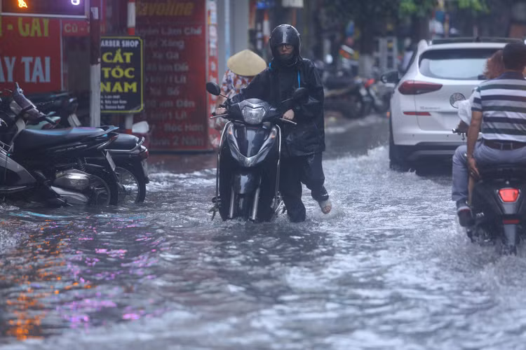 | Trưa ngày 12/6, trận mưa lớn xối xả, kèm dông, lốc, sấm sét đã khiến nhiều tuyến phố thuộc khu vực nội thành Hà Nội đã rơi vào ngập cục bộ, nhiều người phải dắt xe vượt qua các khu vực bị ngập. |