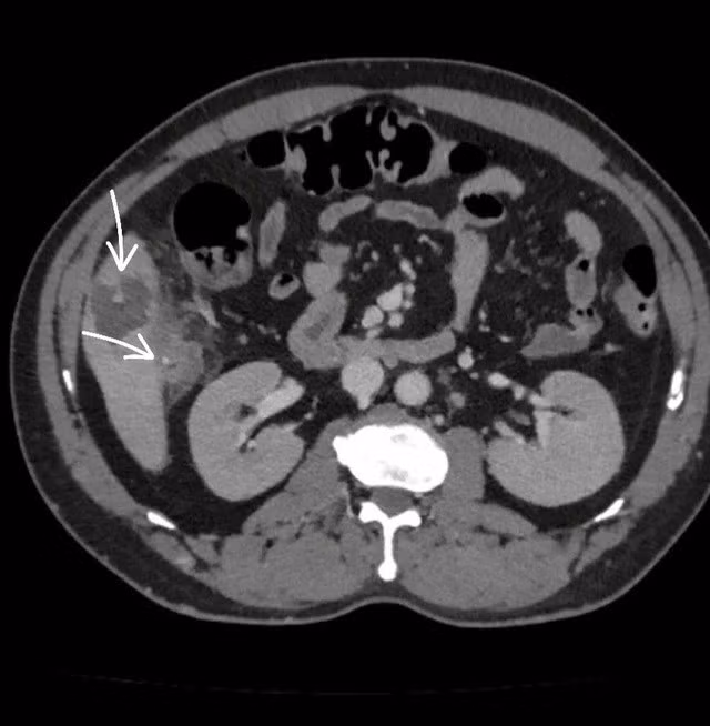 Kết quả chẩn đoán hình ảnh (CT scan) cho thấy một mảnh xương nhỏ xuyên qua thành đại tràng tại góc gan, găm vào nhu mô gan hạ phân thùy V, tạo ổ áp xe kích thước 56x36mm, kèm viêm dày thành đại tràng vùng góc gan. Đây là nguyên nhân chính gây ra ổ nhiễm trùng nguy hiểm. Bệnh nhân nhanh chóng được các bác sĩ phẫu thuật nội soi, lấy dị vật và xử lý ổ áp xe thành công. Sau phẫu thuật, bệnh nhân đáp ứng với điều trị, tình trạng dần ổn định và được chuyển sang Khoa Ngoại Tiêu hóa để tiếp tục điều trị.