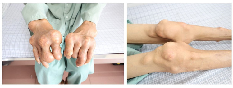 Bệnh nhân nhập viện với nhiều khối u nổi quanh khớp bàn tay, khuỷu tay, gối và bàn chân. Các hạt tophi khắp tứ chi, biến dạng cấu trúc giải phẫu, ảnh hưởng nghiêm trọng đến khả năng vận động, cầm nắm và đi lại.