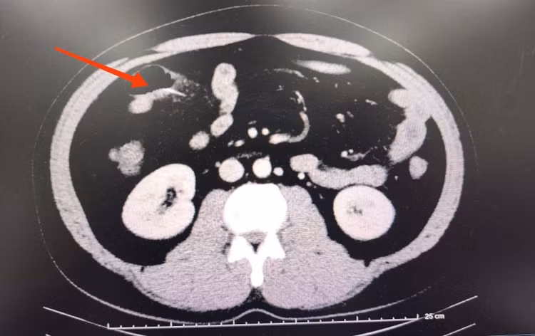 Chụp CT phát hiện một chiếc tăm tre sắc, dài khoảng 3 cm, đâm xuyên thành ruột non gây viêm dày quai ruột.