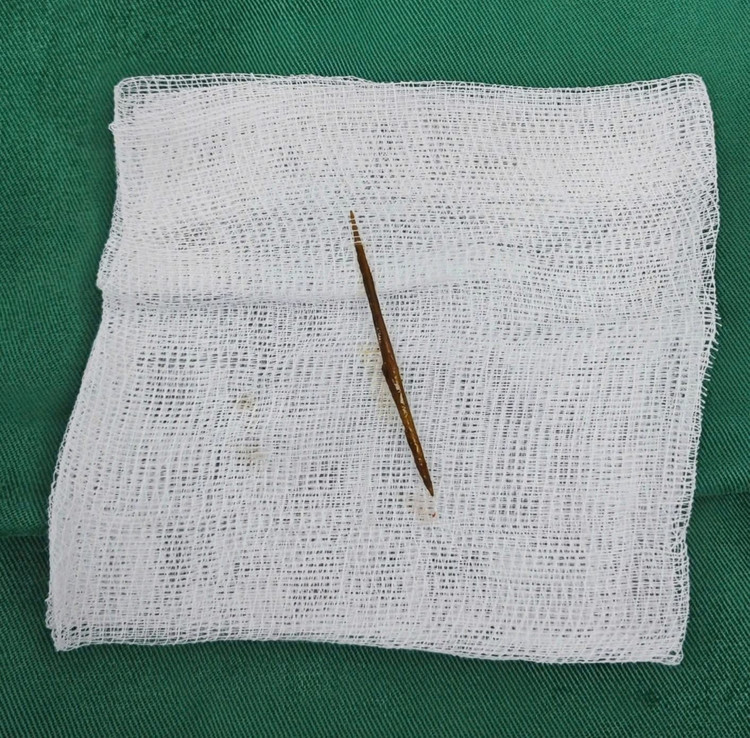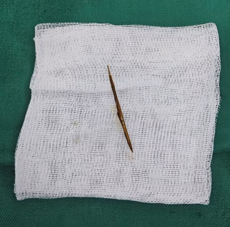 Bệnh nhân được phẫu thuật cấp cứu, lấy dị vật và khâu lỗ thủng. Nhờ can thiệp kịp thời, người bệnh hồi phục tốt và xuất viện sau 9 ngày.