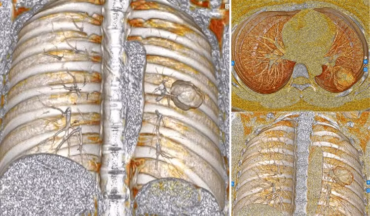 Kết quả chụp CT lồng ngực có tiêm cản quang cho thấy hình ảnh u thùy dưới phổi trái/Ảnh Medlatec