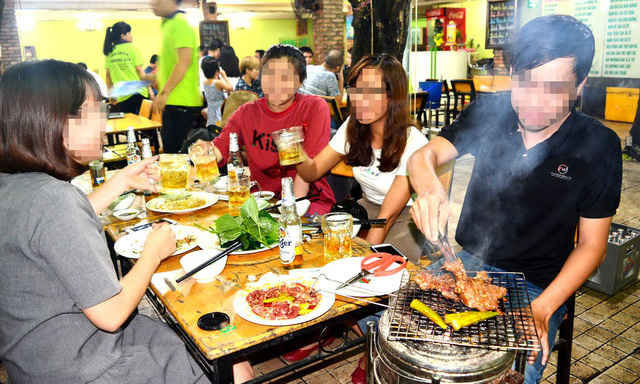 Ngồi bàn bên cạnh là vợ chồng chị Quỳnh Trang và hai con nhỏ. Chị Trang cho biết lâu lâu cả nhà dẫn nhau đi ăn thịt trâu cũng thú vị.