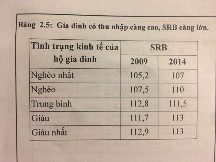 Ở nhóm dân cư giàu, tỉ số này là 113 trai/100 gái, trong khi đó nhóm dân cư nghèo đạt 107 bé trai/100 bé gái.