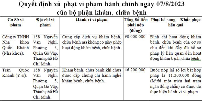 Cũng tại Nha khoa Quốc Khánh, Thanh tra Sở đã tiến hành xử phạt đối với ông Trần Quốc Khánh (Y sỹ) số tiền 46,2 triệu đồng và buộc nộp lại 11,2 triệu đồng có được do thực hiện hành vi vì có hành vi khám chữa bệnh khi chưa có chứng chỉ hành nghề.