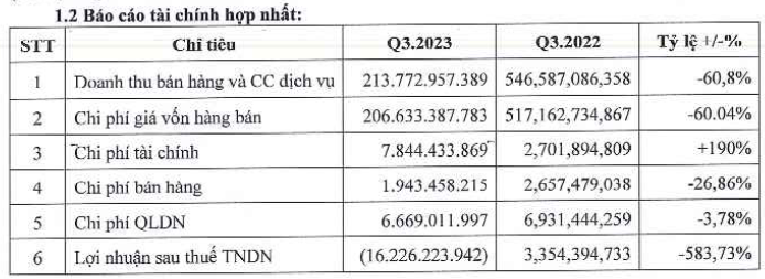 Theo BCTC hợp nhất quý 3/2023 của Tập đoàn Nhựa Đông Á (HOSE: DAG), doanh thu thuần ở mức 213 tỷ đồng, sụt giảm gần 61% so cùng kỳ 2022.