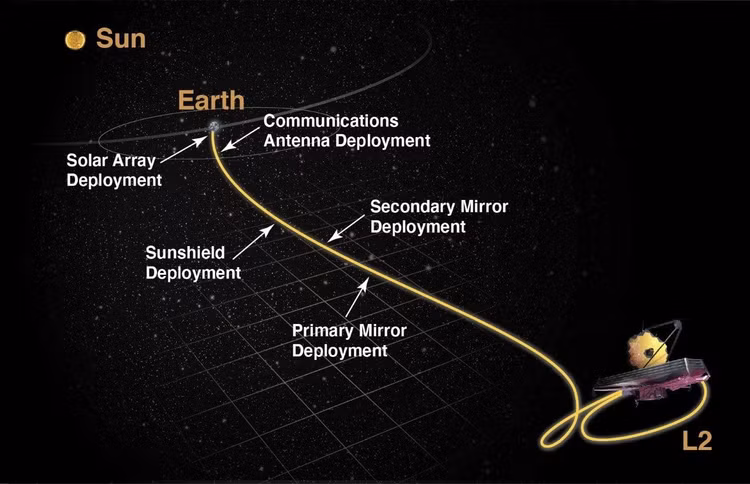 Khi chụp ảnh, JWST đã đến đích, điểm L2 trên khoảng cách khoảng 1,4 triệu km (869.920 dặm) từ Trái Đất (điểm Lagrangian L2 (thứ 2) của hệ thống Trái Đất-Mặt Trời. Khi nhìn từ Mặt Trời, điểm L2 đó nằm ngay sau Trái Đất.