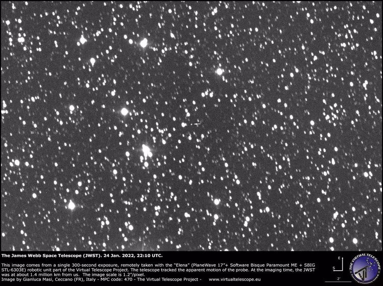 Ảnh JWST chụp ngày 24/1 bằng Elena. Kính viễn vọng robot này tự động theo dõi chuyển động rõ ràng của JWST và thực hiện một bức ảnh tích hợp 300 lần chụp cho thấy vị trí của kính viễn vọng (được chỉ bằng một mũi tên ở trung tâm).