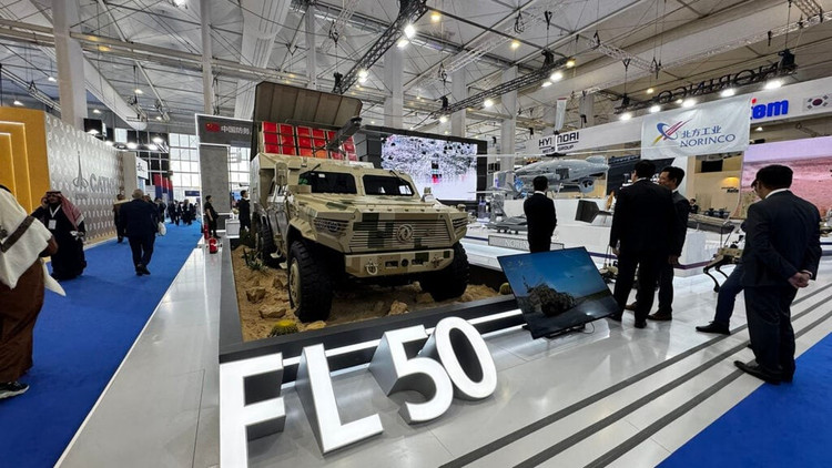 Tập đoàn quốc phòng Trung Quốc Norinco giới thiệu xe bọc thép FL 50 tại Triển lãm. Xe nổi bật với giáp B6, động cơ Ford 6.8L V10 362 mã lực, chứa 14 người, đạt tốc độ 150 km/h và trang bị tháp pháo hơi cay. (Agnes Helou / Breaking Defense)