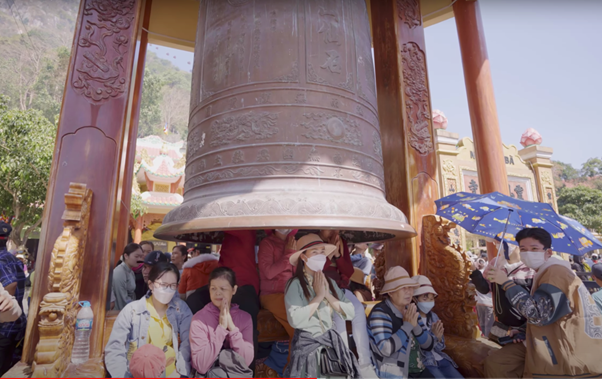 Nhiều người chia sẻ, ngồi dưới miệng hồng chung và nghe tiếng chuông âm vang cảm thấy vô cùng thanh tịnh và bình yên. m thanh dưới miệng chuông không hề lớn mà rất nhẹ nhàng, có thể cảm nhận sóng âm liên tục lan tỏa xung quanh miệng chuông. Anh Phạm Hùng (Củ Chi) cho biết: “Tôi nghe nói âm thanh này cho cả những người cõi âm và cõi trên nghe được. Vì vậy, ngồi cầu nguyện dưới miệng chuông sẽ có thể giải được vong âm, tiêu tan nghiệp chướng và đem lại may mắn”.