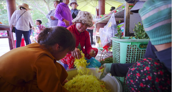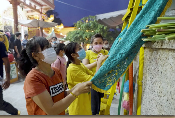 Cũng ngay tại khu vực chùa Bà, một nghi thức mà hầu như ai đến đây cũng thực hiện là thoa tay hoặc chùm áo choàng của tượng Quan m Bồ Tát lên đầu, lên người để cầu sức khoẻ và may mắn.
