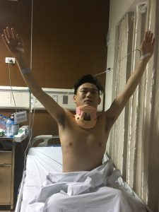 Sau 40 phút trên bàn phẫu thuật trở về buồng bệnh, anh Lê Văn Thành (31 tuổi, Hải Dương) tỉnh táo hoàn toàn, giơ thẳng hai tay lên trước mặt. BN cho biết, anh bị đau vai gáy hơn 1 năm nay, tưởng do công việc mệt mỏi, ngồi lâu, uống thuốc đỡ nhưng 2 tháng nay tay phải không nhấc lên được. Anh đi kiểm tra chụp cộng hưởng từ phát hiện thoái hóa cột sống cổ kèm TVĐĐ. Trong khi mổ anh phối hợp cử động, nói chuyện cùng BS trong mọi thao tác để tránh tai biến về thần kinh. Anh rất vui vì sau mổ đỡ đau và tay phải đã giơ lên được.
