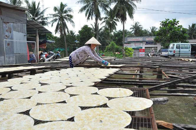 Người dân phơi bánh ở làng nghề bánh phồng Sơn Đốc (Giồng Trôm, Bến Tre).