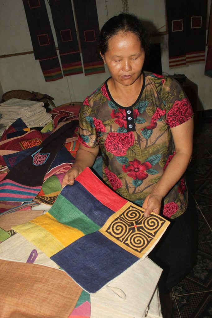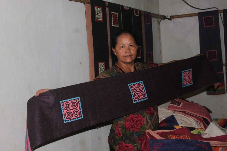 Chị Mai và mẫu vải Mông do ĐSQ Canada đặt hàng.