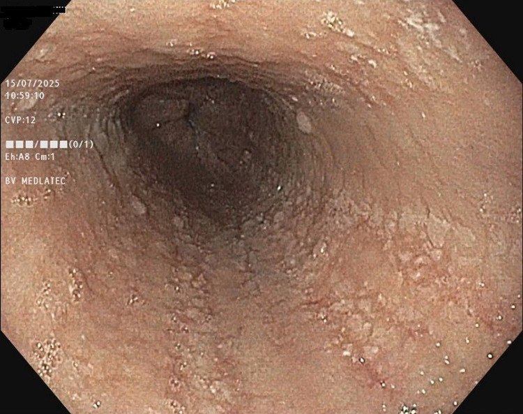 Nội soi thực quản cho thấy, niêm mạc thực quản phù nề, mất mạng lưới mạch bình thường, xuất hiện nhiều vòng đồng tâm, rãnh dọc sâu dọc theo chiều dọc thực quản, kèm theo các chấm trắng nhỏ rải rác trên bề mặt niêm mạc. Các tổn thương này là hình ảnh đặc trưng của viêm thực quản tăng bạch cầu ái toan. Bác sĩ đã sinh thiết lấy mẫu mô thực quản để làm giải phẫu bệnh và kết quả phù hợp với viêm thực quản tăng bạch cầu ái toan. Cùng với đó, kết quả nội soi dạ dày có viêm teo dạ dày (C1).