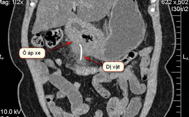 Sau khi thực hiện các kỹ thuật cận lâm sàng và chụp hình ảnh cắt lớp vi tính CT- Scanner bác sĩ phát hiện một tổn thương khu trú, có dị vật cản quang trong thành dạ dày vùng môn vị. Ê-kíp nghi ngờ dị vật có thể bằng kim loại, có dấu hiệu nghi áp xe thành dạ dày vùng hang môn vị.