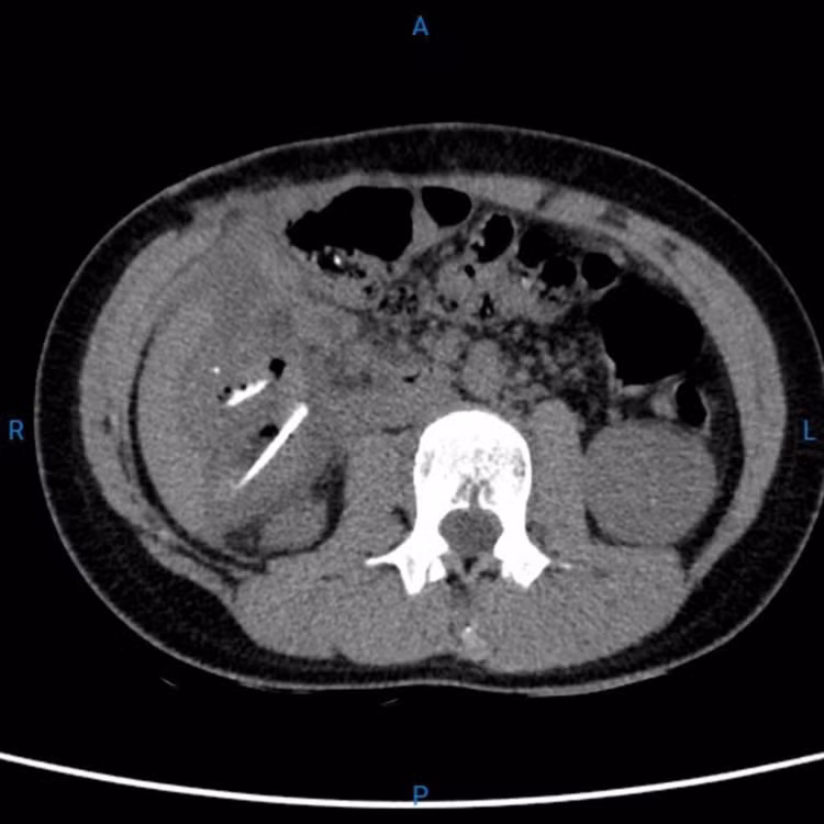 Bệnh nhi 13 tuổi, ở Lâm Đồng nhập viện trong tình trạng đau bụng dữ dội vùng bụng phải, kèm nôn ói suốt bốn ngày. Gia đình cho biết trẻ có thói quen ăn nhanh, không nhai kỹ, đặc biệt luôn xem ti vi, điện thoại khi ăn. Cách nhập viện một tuần bệnh nhi có ăn thịt gà nhưng không có gì đáng lưu ý như hóc xương, lúc ăn bé có xem điện thoại như mọi khi.