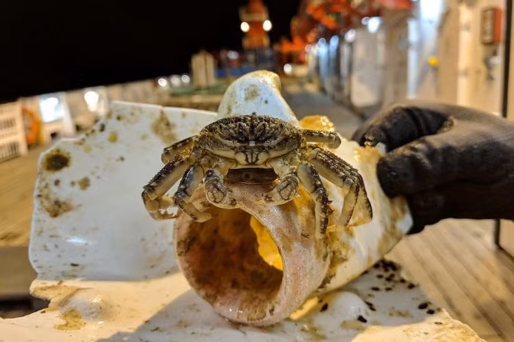 Cua biển bám trên vật phẩm macroplastic, do tàu nghiên cứu SONNE của Đức thu được trong chuyến hải trình SO268/3 qua Bắc Thái Bình Dương từ Vancouver đến Singapore mùa hè năm 2019. Nguồn: © Gritta Veit-Köhler Senckenberg