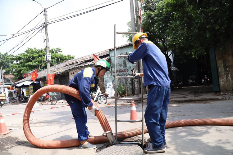 Dầm mình trong nước cống hôi thối, nhóm công nhân dùng rổ để vớt các loại rác. Lịch khơi thông các cống được thực hiện theo định kỳ, tuy nhiên vào mùa mưa phải vớt liên tục để đảm bảo cống luôn thông thoáng, không gây ngập đường.