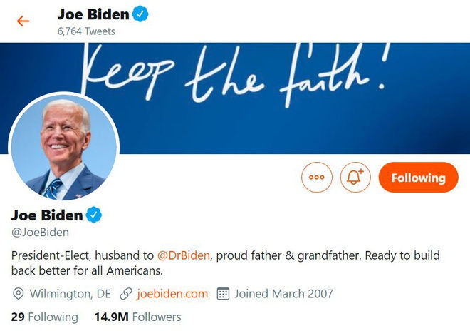 Trên tài khoản Twitter chính thức, ông Joe Biden đã điều chỉnh thông tin cá nhân của mình thành "Tổng thống tân cử". Cùng lúc đó, bà Kamala Harris cũng đổi thông tin cá nhân thành "Phó tổng thống tân cử của nước Mỹ".